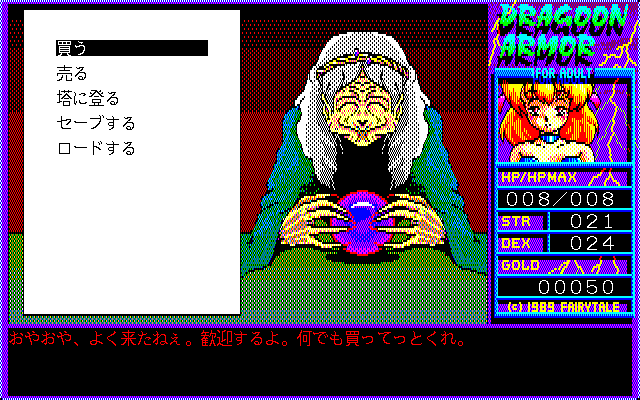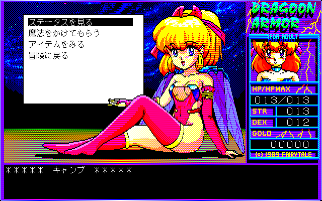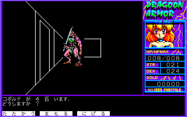 The lovely princess was abducted by a mysterious giant black bird. The bird carried the prisoner to a tower on the lake shore. Who would be brave enough to venture into the tower and to rescue the princess? Only the courageous knight Landis, aided by the Goddess herself! Dragoon Armor for Adult is a very basic first-person dungeon crawler, with vector graphics (like in early Wizardry games), but without party members; Landis explores the similarly-looking mazes (no auto-map feature) all by himself, fighting randomly appearing enemies in simple turn-based combat. It is possible to buy weapons, armor, and items outside, but there are no other locations to access beside the tower. Event cut-scenes may feature nudity, but no "hardcore" sexual situations.